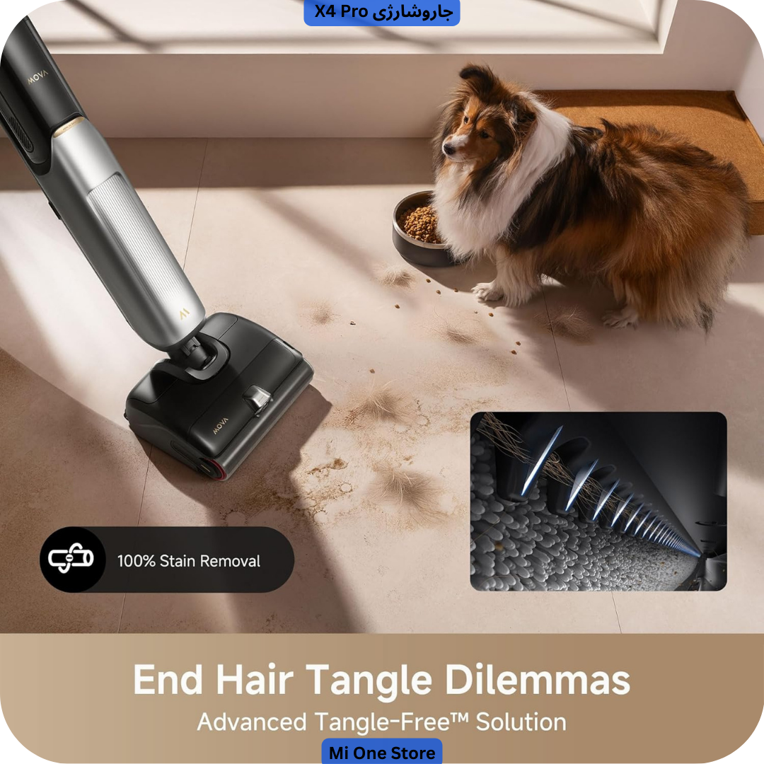 اگر در خانه‌تان حیوان خانگی دارید یا افراد با موی بلند زندگی می‌کنند، احتمال گرفتن مو روی برس جارو زیاد است و تمیز کردن آن دردسر دارد. Mova X4 Pro این مشکل را با فناوری مناسب رفع کرده است. این جاروشارژی دارای برس با طراحی دندانه‌دار و اسکرِیپر مخصوص است بدین ترتیب که تیغه یا اسکرِیپر با دندانه‌هایی مثل شانه طراحی شده است که موها را به طور مؤثر از برس جدا می‌کند و از گره خوردن جلوگیری می‌کند. عملکرد ۱۰۰٪ بدون گره (Tangle-Free) دارد کاربران گزارش داده‌اند که حتی پس از استفاده مکرر، مو یا پر حیوانات روی برس گیر نمی‌کند و نیازی به دستکاری دستی نیست. جاروشارژی X4 Pro دارای مکش قوی همزمان با فناوری ضد گره است. این دستگاه با مکش ۲۰,۰۰۰ پاسکال در کنار اسکرِیپر، به راحتی موها و گرد و غبار را جمع می‌کند بدون اینکه موها دور برس بپیچند. بنابراین این جارو انتخاب بسیار مناسبی برای خانه‌هایی با حیوان خانگی، کودکان یا فضای پرتردد است.