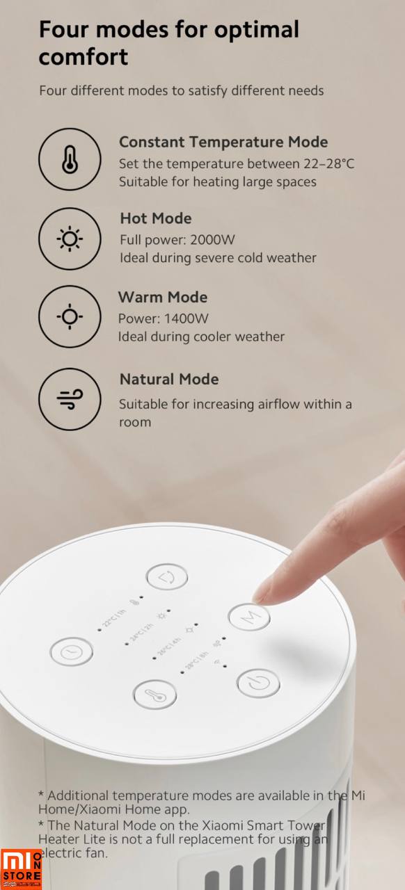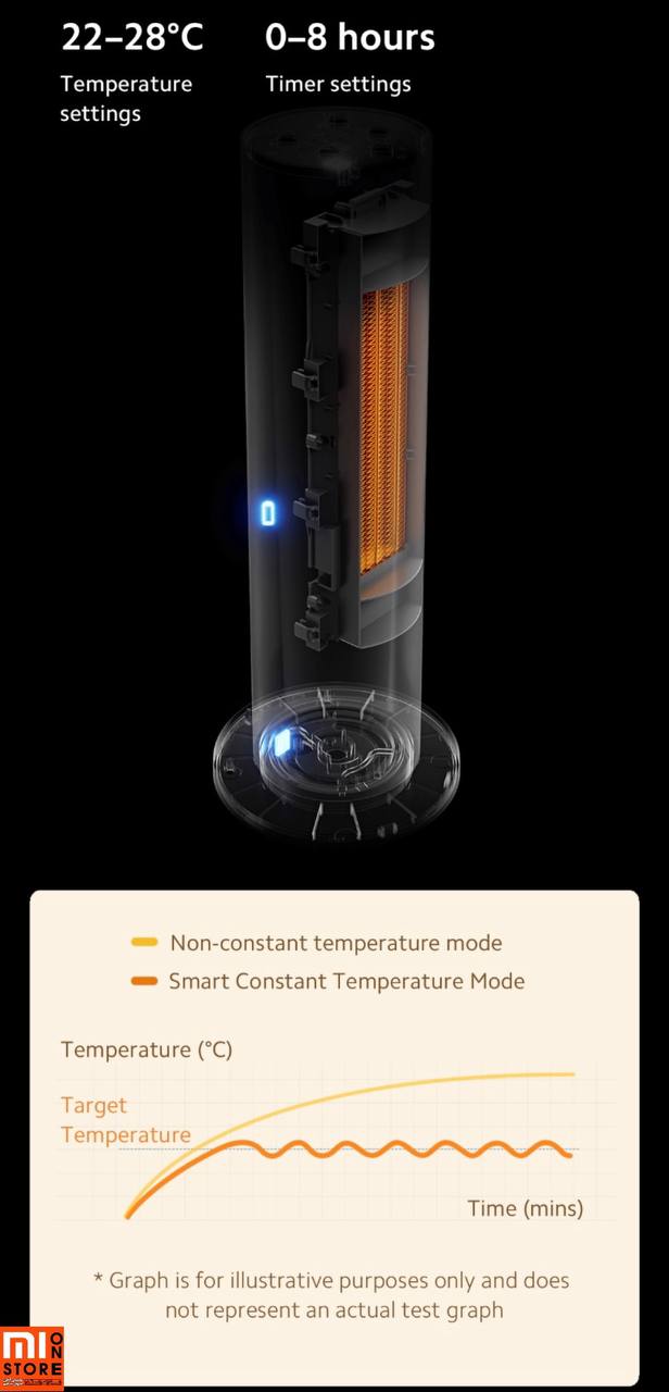 • هیتر بخاری هوشمند شیائومی مدل Smart Tower Heater Lite می تواند دما را بین 22 تا 28 درجه سانتی گراد تنظیم نماید که این دما بسیار مطلوب می باشد.
