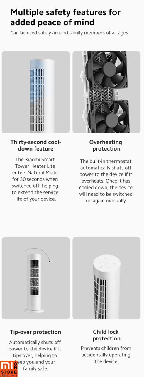 داشتن هیتر بخاری هوشمند شیائومی مدل Smart Tower Heater Lite برای هر خانه ایی الزامی است، زیرا اگر گاز به هر دلیلی قطع شود شما برای خانه تان وسیله گرمایشی لازم را فراهم کرده اید. هیتر برقی Smart Tower دارای محافظ قفل کودک است که از کارکرد تصادفی دستگاه توسط کودکان جلوگیری می کند. xiaomi Smart Tower Heater Lite را می توان از راه دور کنترل کرد و هیتر برقی را روشن نمود و وقتی شما به خانه برسید خانه شما گرم و مطلوب باشد. استفاده از این هیتر برقی را به شما در فصل زمستان توصیه می کنیم.