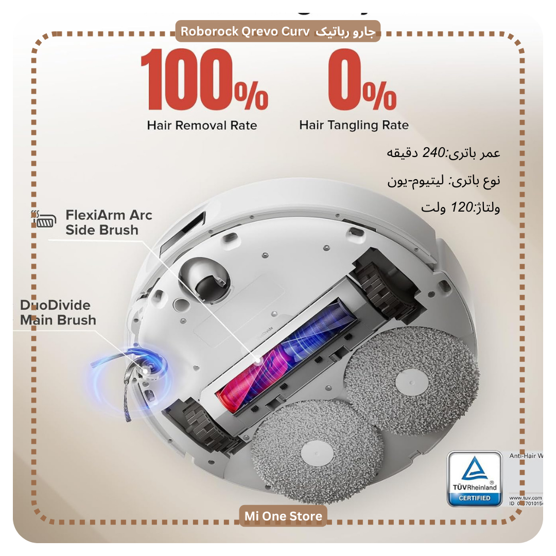 جارو رباتیک روبوراک Qrevo Curv دارای سیستم دوگانه ضد گره خوردگی می باشد که شامل برس اصلی DuoDivide و برس جانبی FlexiArm Arc است که از گره خوردن موها جلوگیری می کند و برای خانههای دارای حیوانات خانگی ایدهآل است.