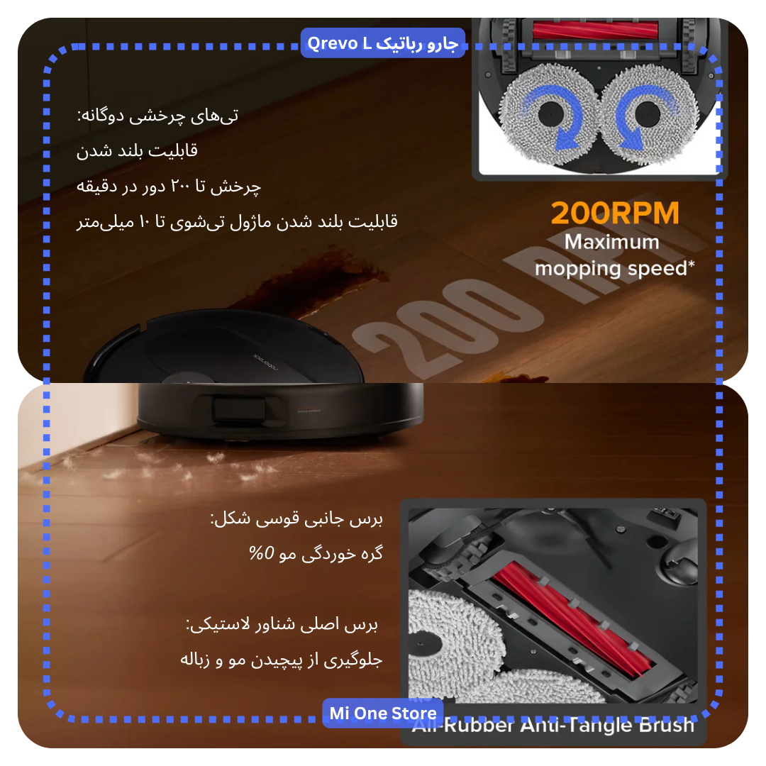 جارو رباتیک روبوراک Qrevo L دارای سیستم دوگانه ضد گره خوردگی است که با برس اصلی شناور لاستیکی با طراحی ویژه و برس جانبی قوسی شکل منحصر به فرد، دیگه مو گره خوردگی پیدا نمی کند.