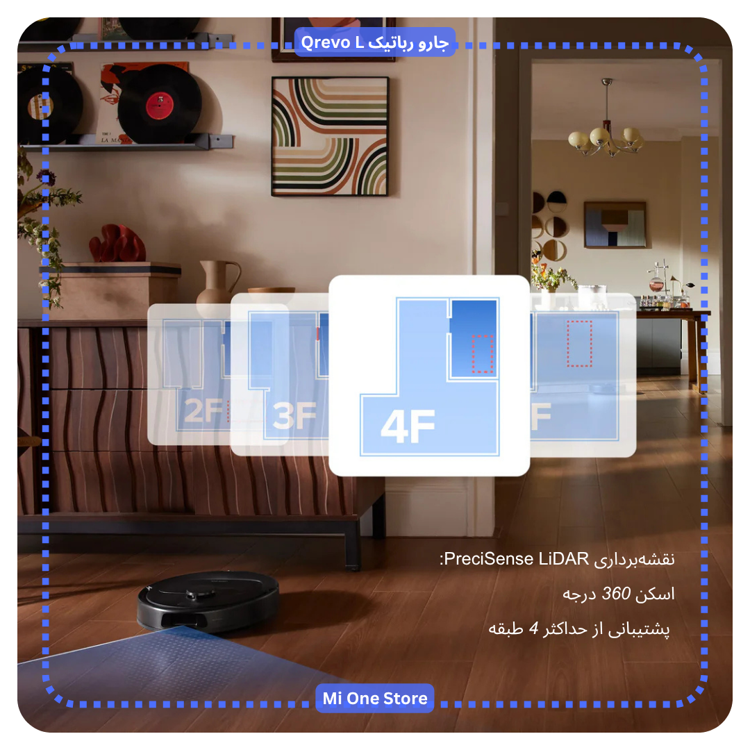 Roborock Qrevo L دارای ناوبری و نقشه برداری PreciSense LiDAR می باشد که سیستم ناوبری می تواند 360 درجه را اسکن کند و همزمان نقشههای دقیقی را برای کارآمدترین ناوبری مسیر ایجاد نماید.