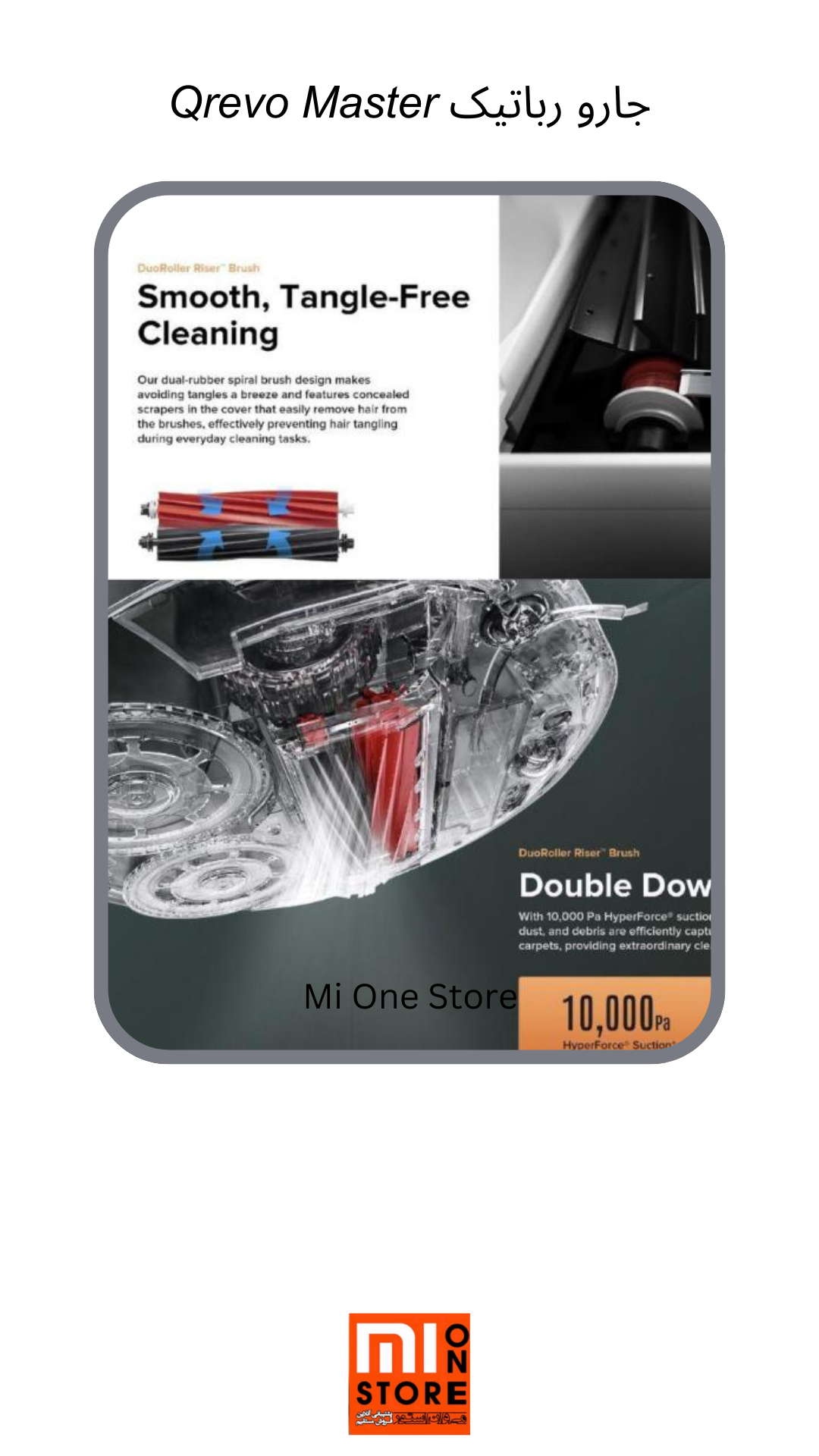 جارو برقی روبوراک Qrevo Master دارای برسهای مارپیچ لاستیکی دوگانه است که می تواند از گره خوردن با خراشهای مخفی جلوگیری کند و عملکرد صاف و بیصدا را برای تمیز کردن روزانه بدون درز تضمین مینماید.