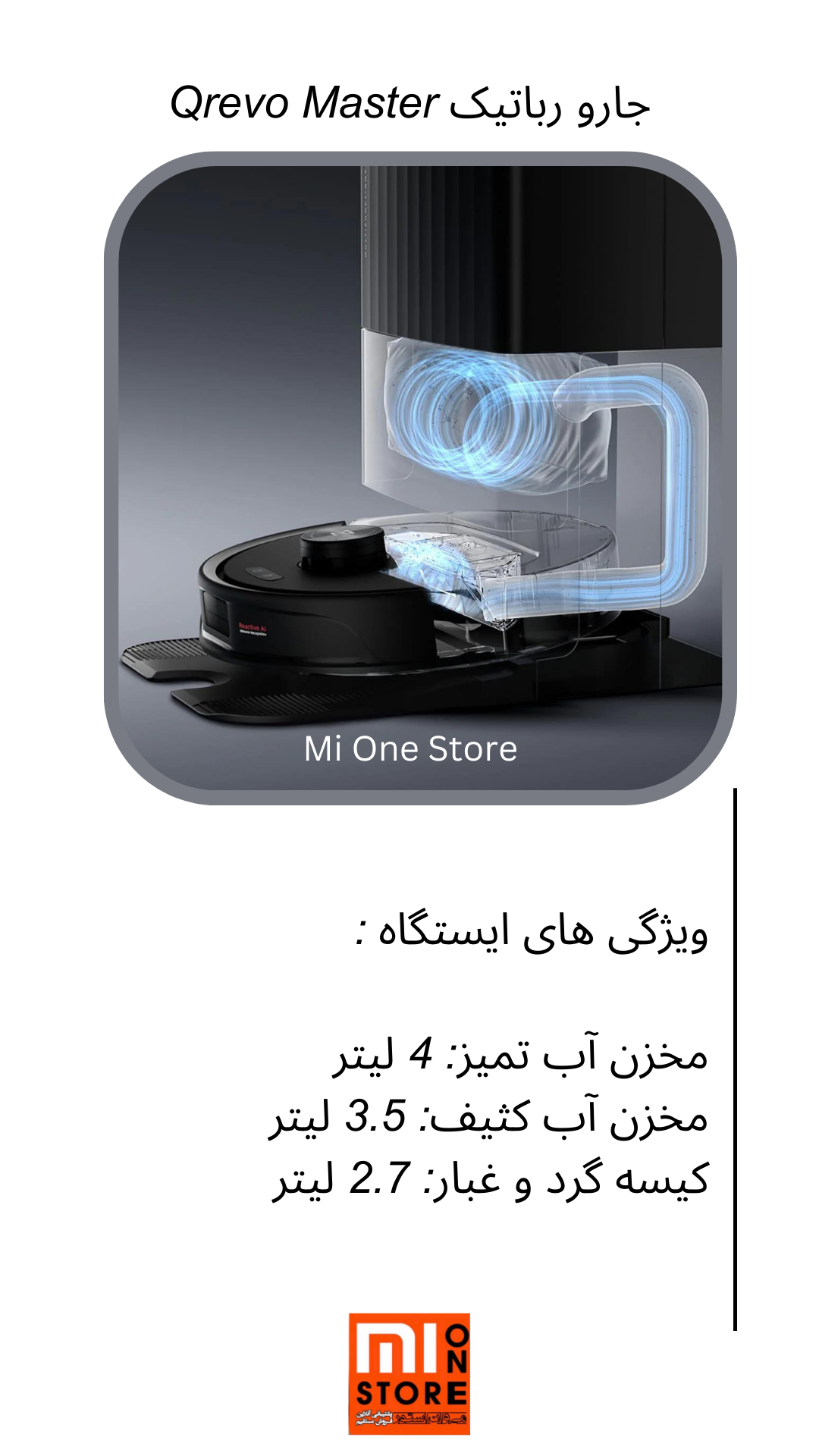 ایستگاه جارو رباتیک Qrevo Master شامل دو مخزن آب با قابلیت دسترسی بالا میباشد: یک مخزن آب تمیز 4 لیتری و یک مخزن فاضلاب 3.5 لیتری. همچنین، یک کیسه گرد و غبار 2.7 لیتری در پشت یک پانل جلویی قابل جابجایی قرار دارد.