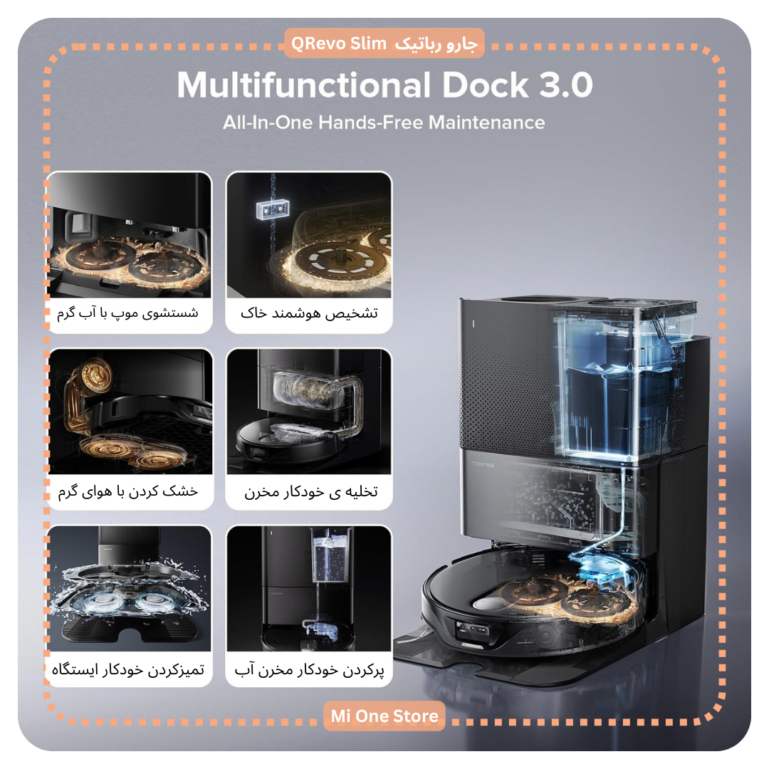جارو رباتیک QRevo Slim دارای سیستم شستشوی خودکار موپ است که به صورت اتوماتیک در ایستگاه شارژ شسته و خشک میشود.