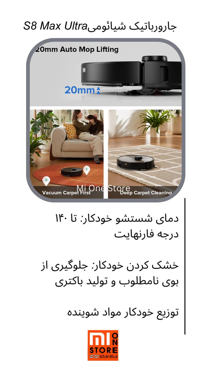 S8 Max Ultra دارای مراقبت کارآمد از فرش می باشد بدین ترتیب که هنگام تمیز کردن فرشها، موکت با بلند کردن ماژول 20 میلیمتری خودکار موپ را بهطور خودکار بلند میکند و از رطوبت ناخواسته جلوگیری میکند.