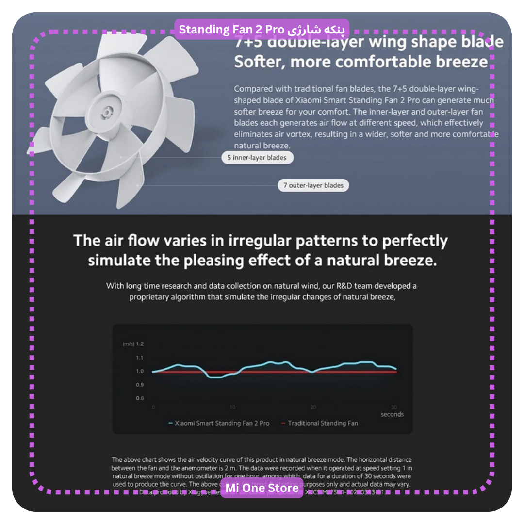 - بر اساس الگوریتم شبیهسازی تصادفی نسیم طبیعی، طراحی پرههای فن دولایه، پرههای لایه داخلی را قادر میسازد تا جریان هوای متمرکز تولید شده توسط پرههای لایه بیرونی را مختل کند و تهویه را گستردهتر و ملایمتر کرده و تجربهای حتی بهتر از نسیمی که در طبیعت میشنوید، برای شما به ارمغان آورد.