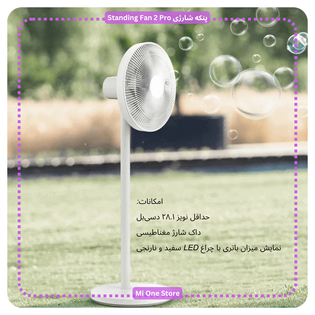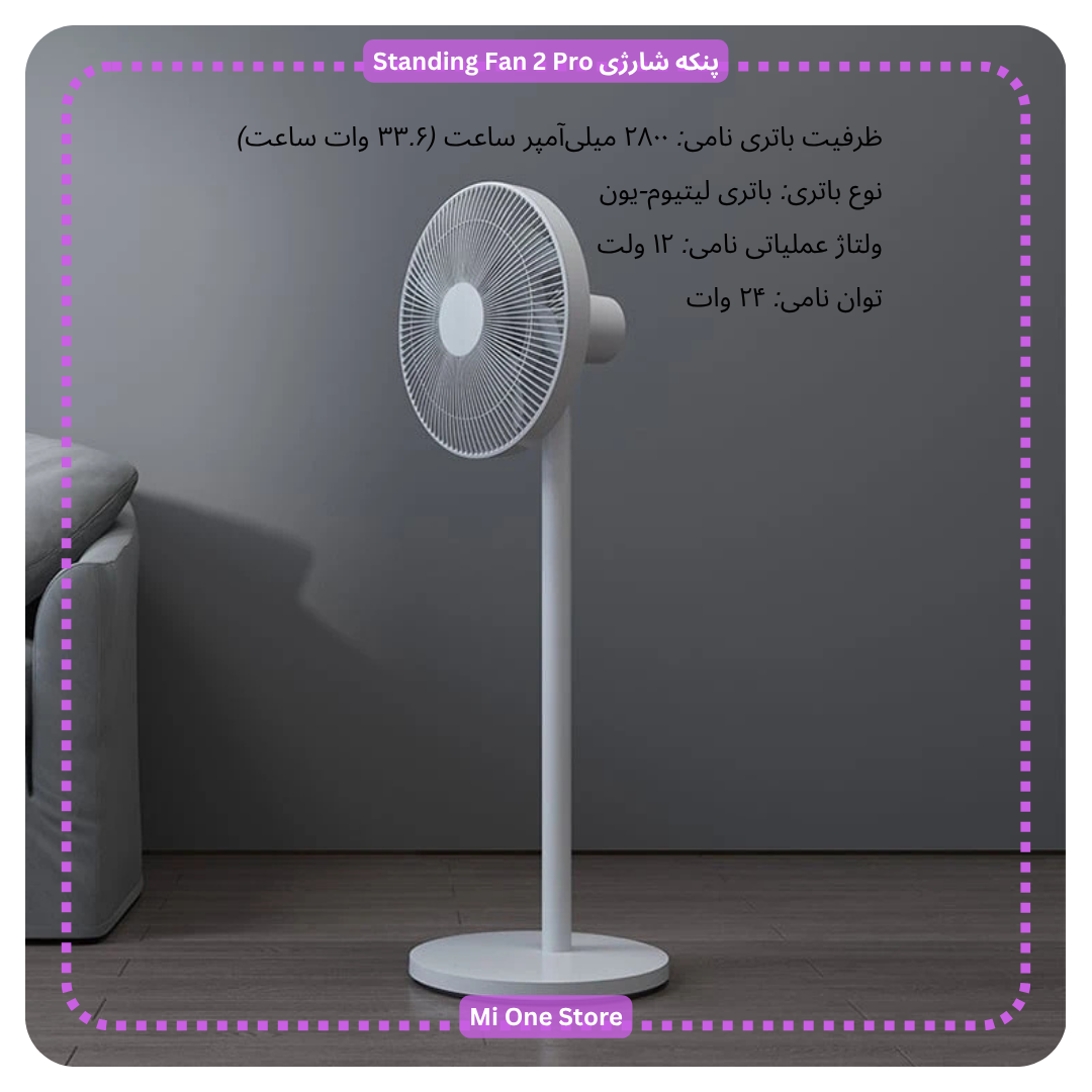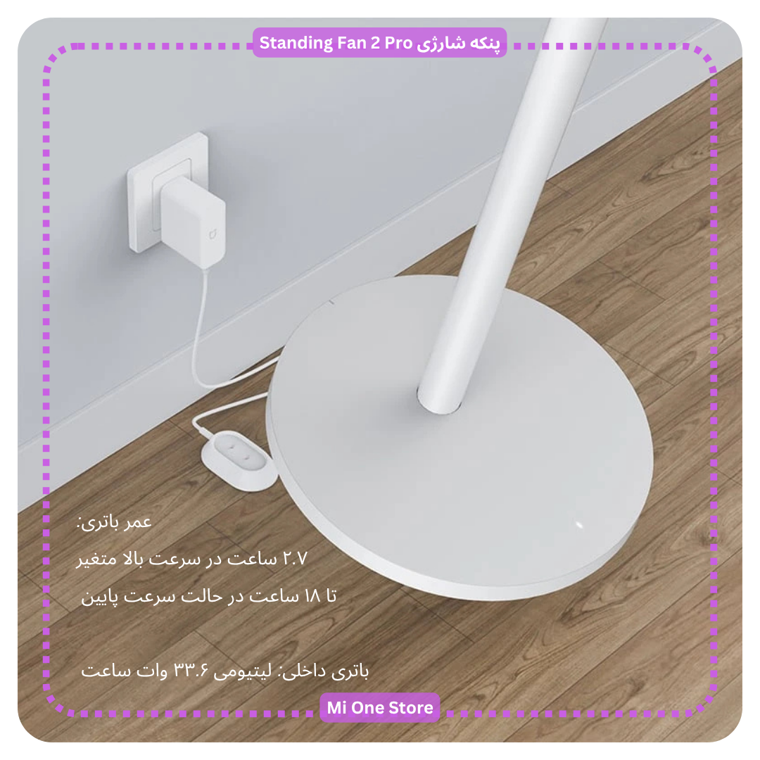 - پنکه شارژی شیائومی مدل Smart Standing Fan 2 Pro دارای باتری داخلی لیتیومی ۳۳.۶ وات ساعتی و طراحی بیسیم می باشد که توانسته محدودیتهای پریز برق را حذف کند و امکان استفاده در هر نقطهای از خانه یا حتی فضای باز را فراهم نماید.