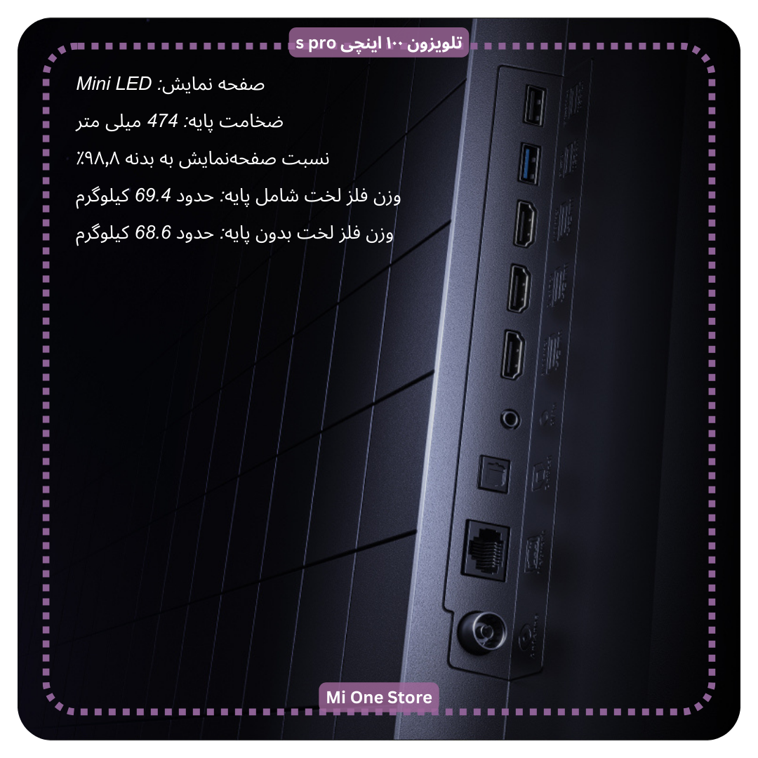 - در تلویزیون ۱۰۰ اینچی شیائومی مدل s pro دو پورت HDMI 2.1 نیز اتصال به دستگاههای مختلف را با تأخیر ورودی کم ممکن میسازد.
