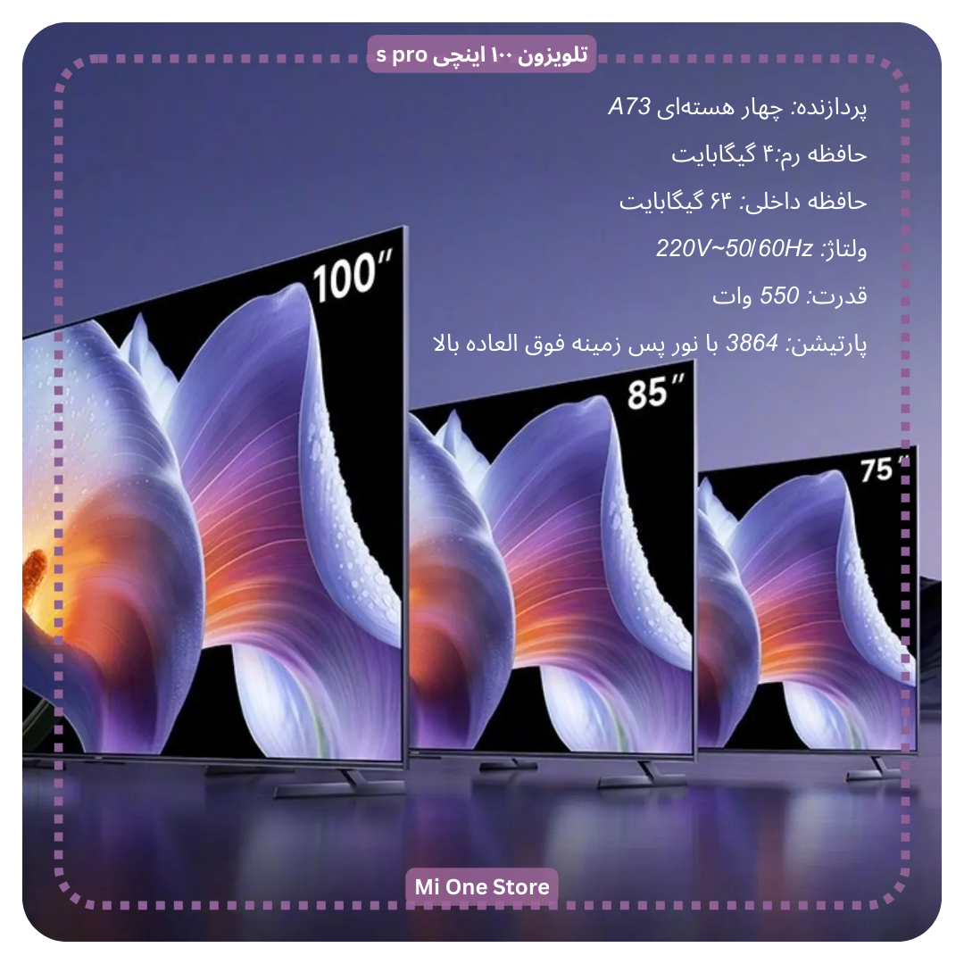 - کیفیت تصویر تلویزون ۱۰۰ اینچی شیائومی مدل s pro با پنل ۱۰۰ اینچی و رزولوشن 4K، تصاویر را با وضوح و جزئیات بالا نمایش میدهد.