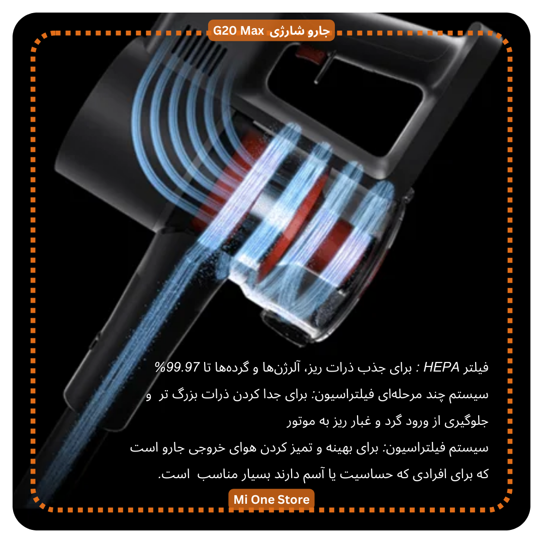 جارو شارژی G20 Max دارای فیلتر HEPA می باشد که توانایی جذب ذرات ریز، آلرژنها و گردهها تا 99.97% را دارد.